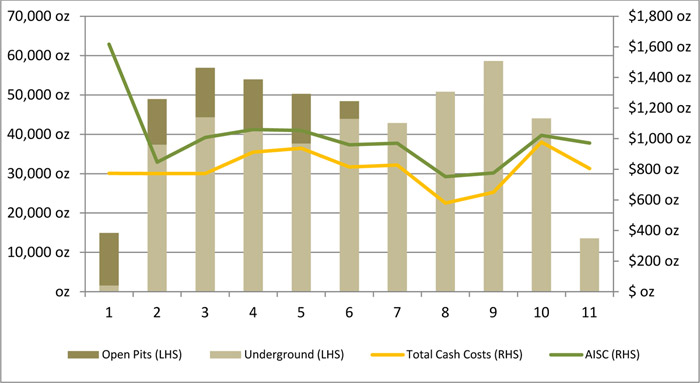 Figure 1: Summary of Projected Annual Gold Production, Cash Operating Costs and AISC