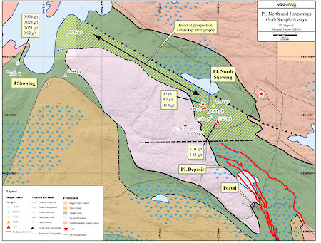 Field work to date supports an interpretation that a gold mineralised, structural trend extends northwest of the PL deposit, is intimately associated with the same footwall tonalite underlying the known PL deposit gold mineralisation. Field work continues to explore the extent and characteristics of this prospective structural zone that occurs at the tonalite contacts beyond the currently defined 2km trend between the PL North Showing and the J Showing. Geological mapping and prospecting of these new gold occurrences and several other targets along strike from the PL Mine is ongoing. See geology map with sample locations at www.minnovacorp.ca